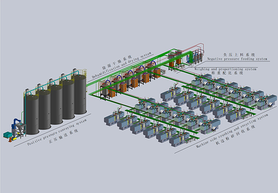 三、个性化:集中输送系统可以做到不同的使用用户,不同的车间特点,不同的原料使用要求。都可以依实际的需要来设计出更优化的方案。