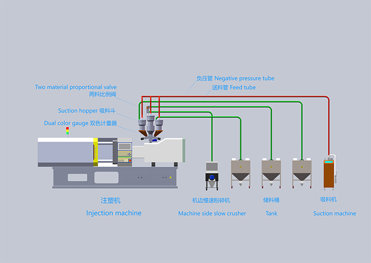 二、节能:集中输送系统操作简易,只需要少数的几个人即可以控制整个注塑工厂的供料需求,从而减少了大量的劳动力成本。其次、减少了在注塑机旁边的原料带及相应的辅助设备、提高了空间的利用率。此外、由于采用了集中供料的方式、相对应地减少了很多的单机设备,也就节省了电能及减少维护费用。